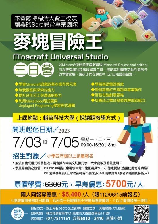 | 二、 | 小學4年級以上孩童報名,無須麥塊或程式相關基礎,需會操作中英文切換打字、大小寫以及滑鼠使用。 |
