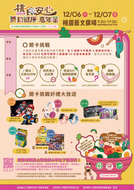 | 三、 | 本活動自114年11月10日起於桃食安心資訊平台另有獲得美食券及摸彩劵之活動訊息,即「看影片,填問卷」和「街舞比賽初賽票選」等,歡迎鼓勵學童與家長共襄盛舉。 |
