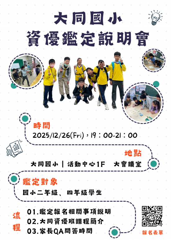(三) 內容:國小資優鑑定報名事項說明、大同國小一般智能資優班課程介紹。
