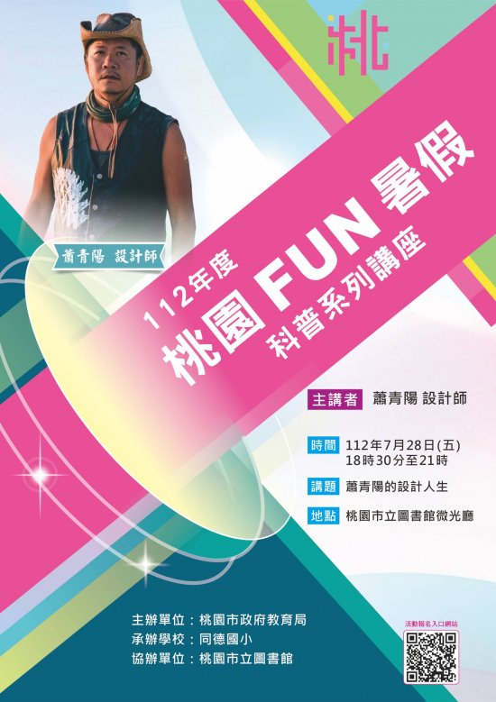 | 一、 | 為迎接暑假,本局於桃園市立圖書館總館舉辦旨揭系列科普講座,講座內容多元,歡迎民眾、學生及家長一同參與,了解關於科技、太空與設計等的科普知識。 |