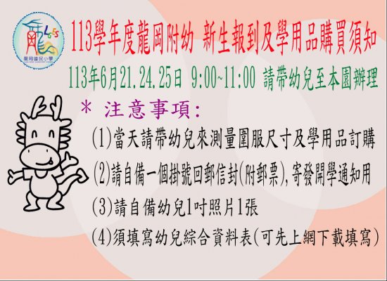 113學年度本校幼兒園新生已於4月30日完成線上報到,期末特安排家長到校測量幼兒圍服尺寸並採購學用品,請家長依下列時間到校辦理,如有問題,請電話聯絡幼兒園,電話03-4588582分機218。