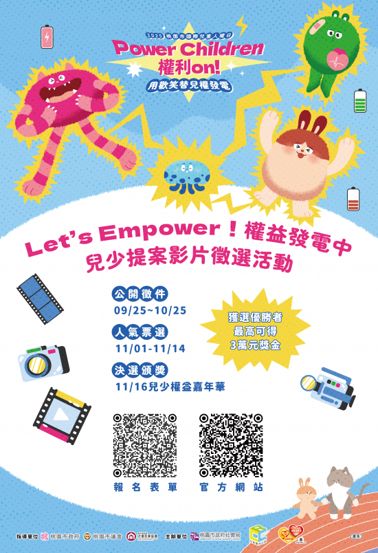 二、 為落實兒少表意及參與公共政策的權利,邀請設籍或實際居住桃園市或就讀桃園市學校11歲(含)以上至18歲以下兒少,針對兒童權利公約政策、法規運行或各類行政事務運作等事項,以拍攝影片的形式,提出檢討及策進,並邀請大眾關注此項議題。