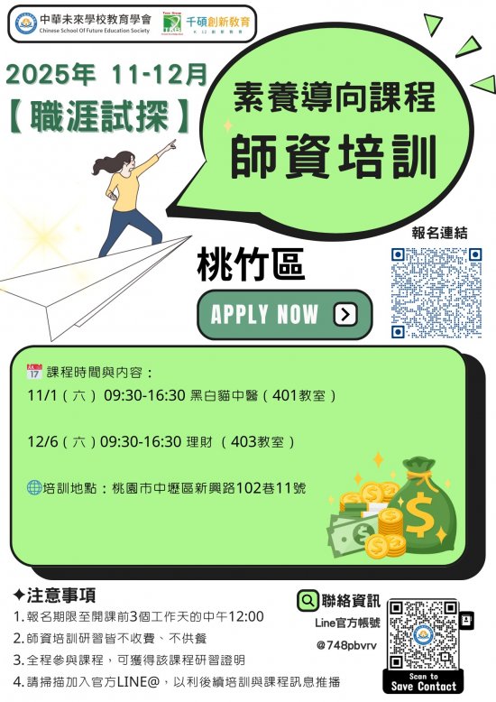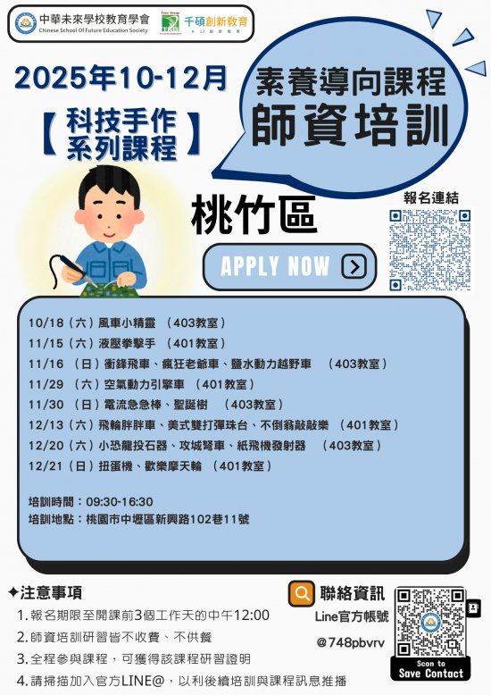 | 二、 | 本系列研習規劃培訓領域,包含職涯試探領域:中醫、理財,科技素養領域:科技手作,以協助教師精進多元素養教學能力,並拓展教學應用成效,詳見海報資訊。 |
